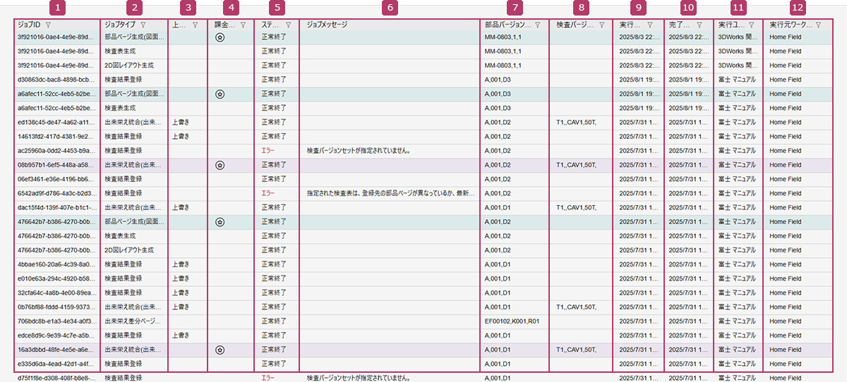 所属しているワークフィールドがホームフィールドの場合は、すべてのジョブが表示されます。所属しているワークフィールドがコラボフィールドの場合は、コラボフィールドで実行されたジョブだけが表示されます。
