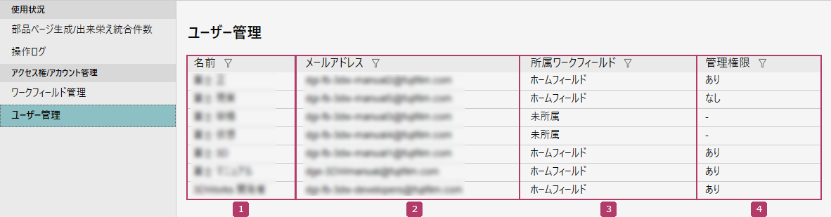 管理権限 | ホームフィールドに所属しているユーザーの、管理権限の有無が表示されます。 |