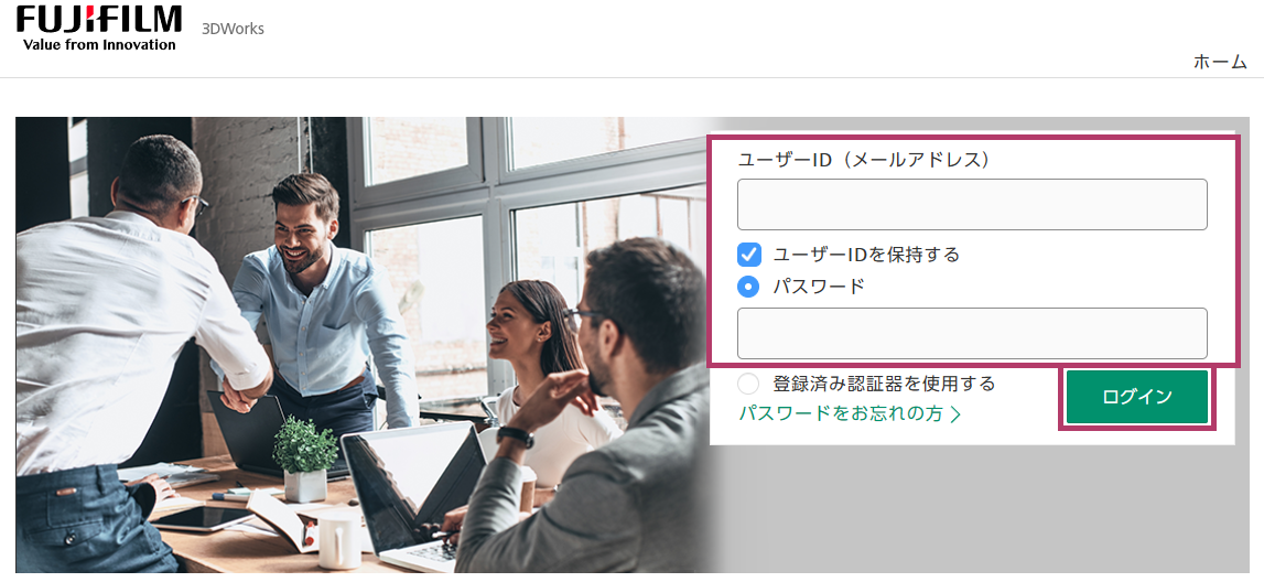 3DWorksを使用するためには、富士フイルムBIダイレクトにログインする必要があります。