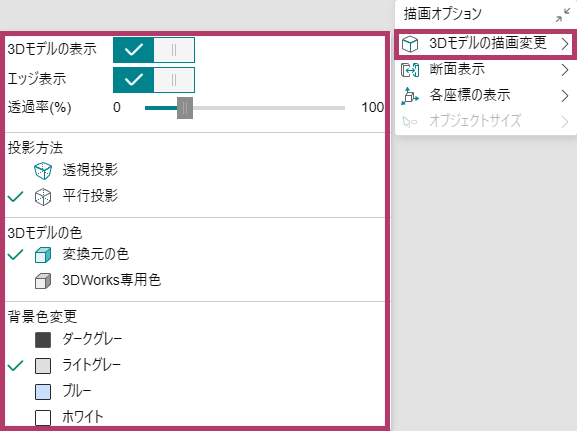 3Dモデルの描画設定は、[描画オプション]ウィンドウで変更できます。