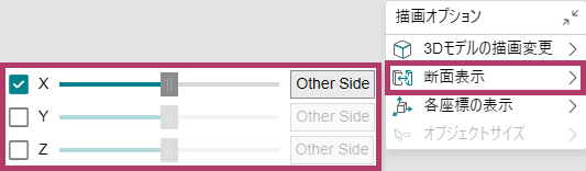 | Other Side | 切断位置から座標軸のマイナス側・プラス側のどちらを表示するかを切り替えます。 |