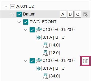 - 異なるデータム座標系のPMIが複数選択された場合、選択されたPMIノードのデータム座標系のうち、チェックボックスにチェックマークが付いている基準面が複数表示されます。ただし、同じデータム系の基準面は1つしか表示されません。