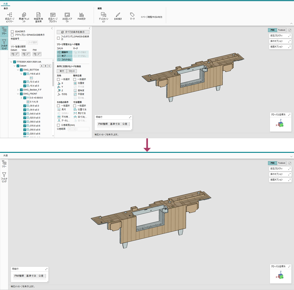 - 3DAオブジェクトまたは出来栄えオブジェクトを選択すると、連動してPMIツリーの該当ノードも選択された状態になります。