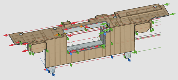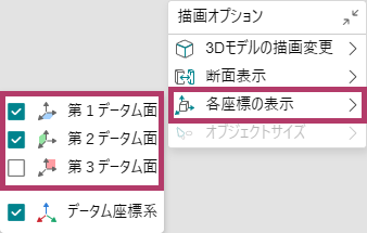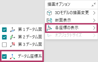 選択中のPMIが属する、各データム系の座標系(原点、軸方向)を示すマーカーを3Dモデル上に表示する方法を説明します。