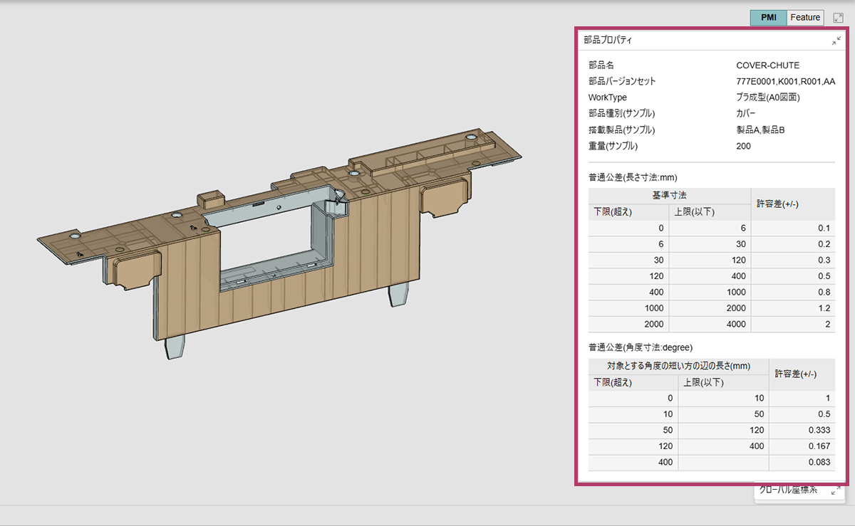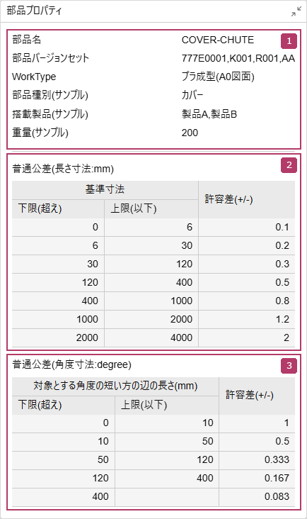 部品ページ生成時に設定した部品情報やWorkTypeに登録されている普通公差を、3D表示領域の[部品プロパティ]ウィンドウで確認できます。