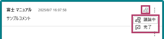 コメントスレッドの親となるコメントには、議論ステータスを示すアイコンが表示されます。[議論中]または[完了]に変更できます。