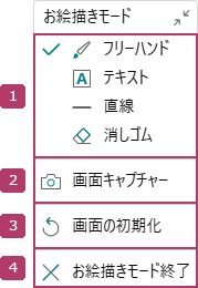 お絵描きモード終了 | お絵描きモードを終了し、[お絵描きモード]ウィンドウを閉じます。 |