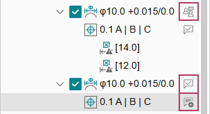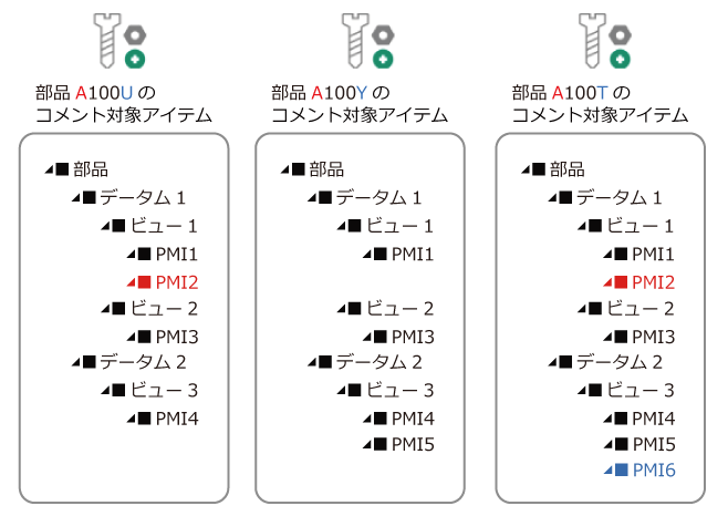 - 複数のビューに配置された同一の3DAオブジェクトは、PMIツリー上でもその数だけPMIノードとして表示されます。ただし、それらのPMIノードのコメントスレッドは同一のコメントスレッドとして扱われます。