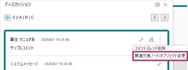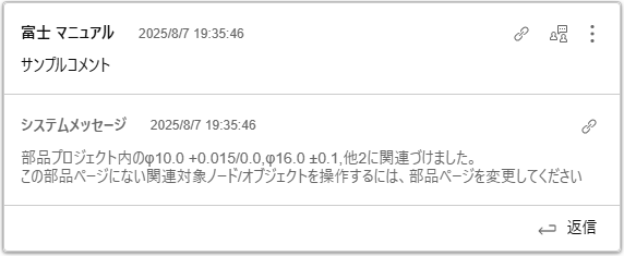 部品プロジェクト内の部品ページに共通するツリーノードのコメントスレッドは、他の部品ページやモードでも追加/閲覧/削除できます。