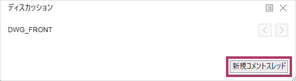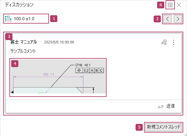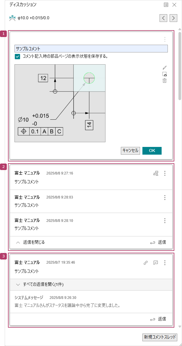 コメントスレッド | 対象アイテムに対するコメントと、その返信コメントをスレッド形式で表示します。 [ディスカッション]ウィンドウでは、1つのツリーノードに対して複数のコメントスレッドを管理できます。 コメントスレッドは、更新日時が新しい順に上から表示されます。
