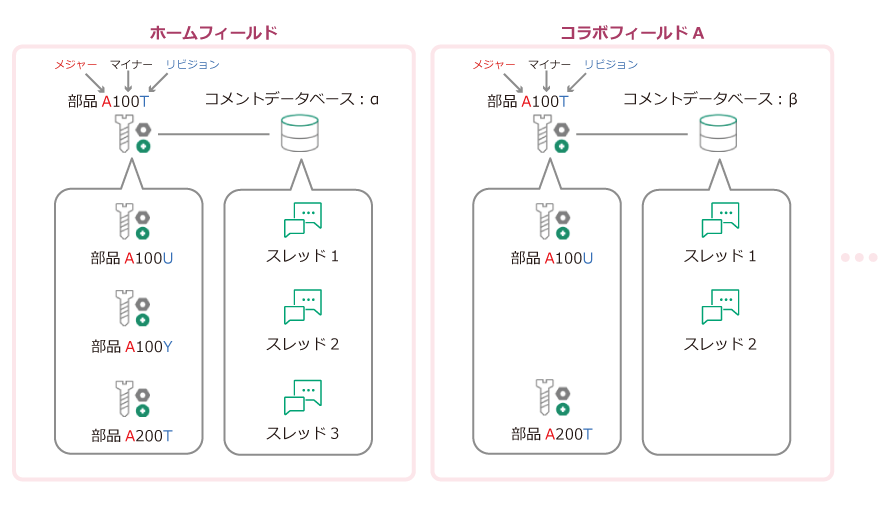 例として、ホームフィールドの部品A100Tのコメントスレッドは、コメントデータベース:αとして管理し、一方で、コラボフィールドAに割り当てられた同一部品A100Tのコメントスレッドの管理はコメントデータベース:βとして管理します。
