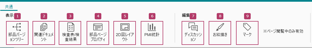 [共通]タブから、部品ページに関連する機能を利用できます。