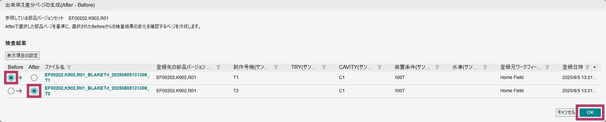 BeforeとAfterの検査結果をそれぞれ選択し、[OK]をクリックします。
