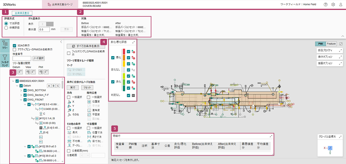 選択したPMIノードについて、出来栄え差分ページを生成するときに比較した最悪値/平均値同士の差分の値、Before/Afterそれぞれの出来栄え評価、良化/悪化判定を参照できます。