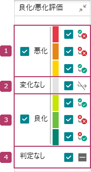 比較した2つの検査結果の判定色が[良化/悪化評価]カラーバーで表示されます。 また、評価ごとにフィルタリングできます。 |