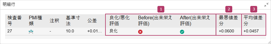 良化 | Afterの検査結果がBeforeと比べて公差中央に近づいた場合に、「良化」と判定します。