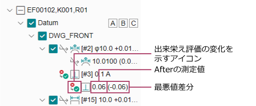 ツリー構成は出来栄えモードと同じです。代表結果/個別検査結果ノードに、BeforeとAfterの出来栄え評価がどう変わったかを示すアイコンが表示されます。