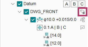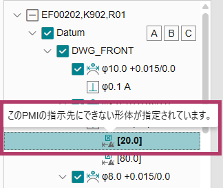 部品ページを生成するときに、セマンティック性の確認が必要なPMIには、PMIノードにセマンティック警告アイコン(寸法公差や幾何公差のアイコンに警告アイコンを重ねたアイコン)が付与されます。