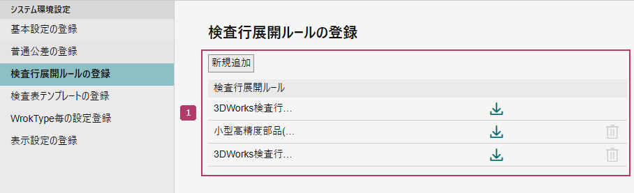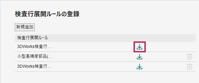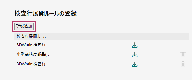 検査行展開ルール | 検査行展開ルールファイルを管理します。 [新規追加]から検査行展開ルールファイルを追加します。 追加したファイルは、ダウンロード/削除できます。
