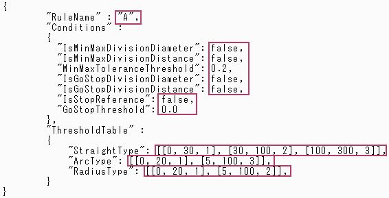 | ThresholdTable(*1) | StraightType | 矩形近似可能な平面、直線、軸を持つ形体に対して「そのサイズの範囲ごとの分割数」を設定します。 | 長さ3のintのリスト |