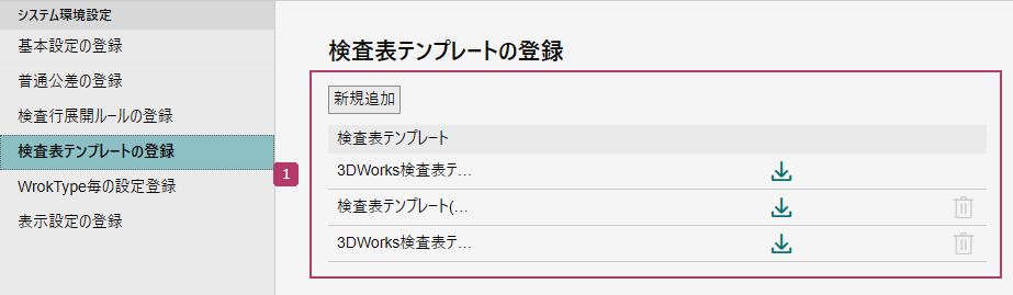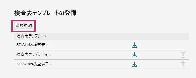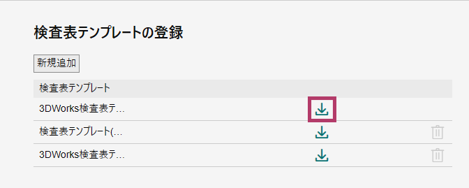 検査表テンプレート | 検査表テンプレートファイルを管理します。 [新規追加]から検査表テンプレートファイルを追加します。 追加したファイルは、ダウンロード/削除できます。