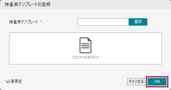 | 検査表テンプレート | [選択]をクリックしてファイル選択するか、ファイルをドロップして、検査表テンプレートファイルを登録します。 |