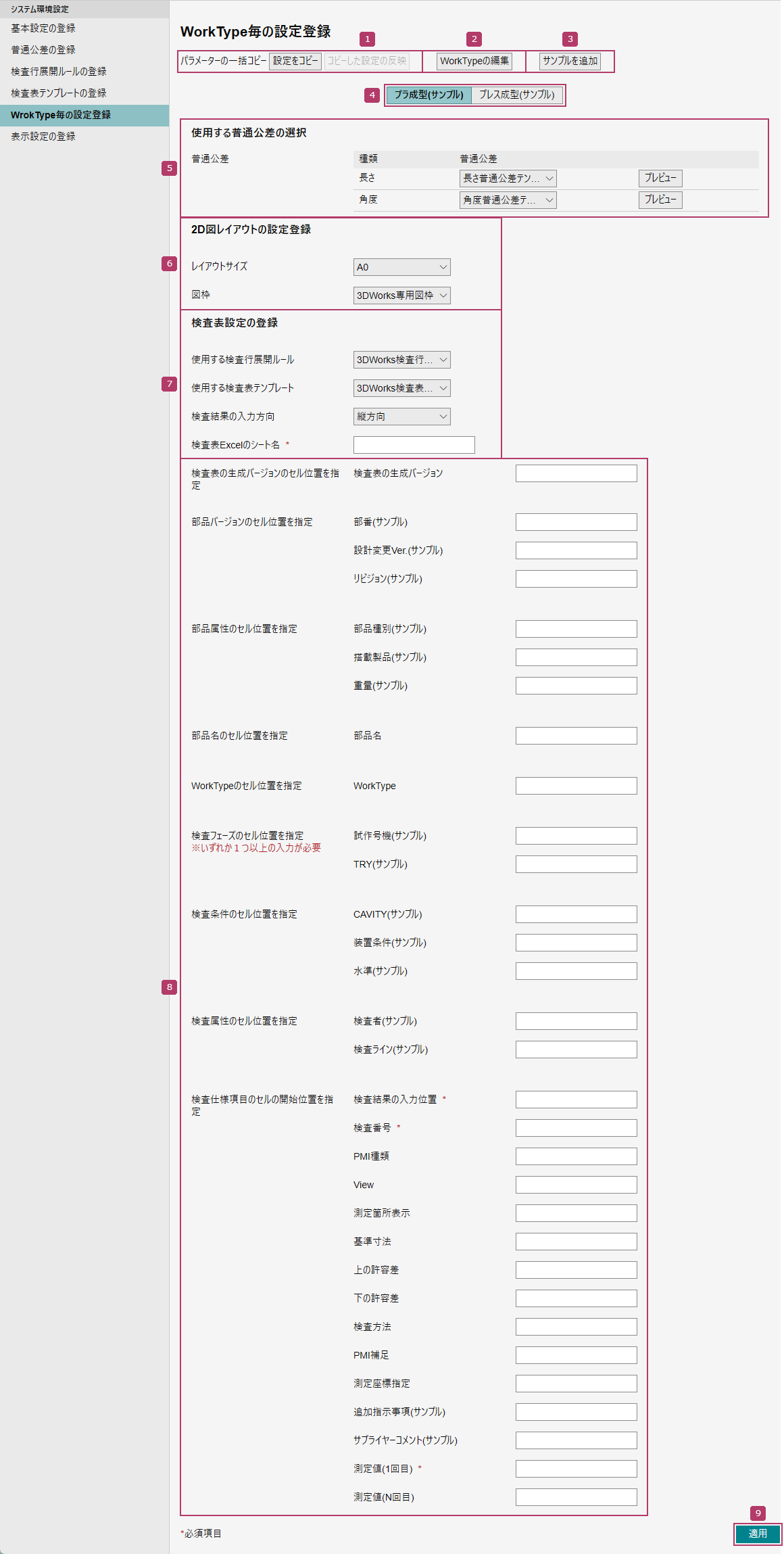 使用する普通公差や、3DWorksで生成する検査表の設定などをWorkTypeとして登録します。