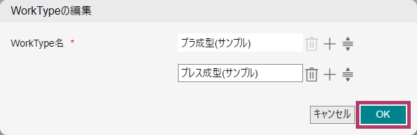 サンプルを追加 | サンプル情報が入力済みのWorkTypeを追加します。 新規にWorkType追加するときに、各項目の設定方法を参考にし、一部だけを修正して使いたい場合に追加してください。 |