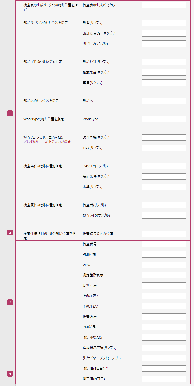検査表の生成バージョンのセル位置を指定~検査属性のセル位置を指定(*1) | 該当項目の検査表のExcelのセル位置を、「A1」のようにアルファベットと数字で指定します。 |