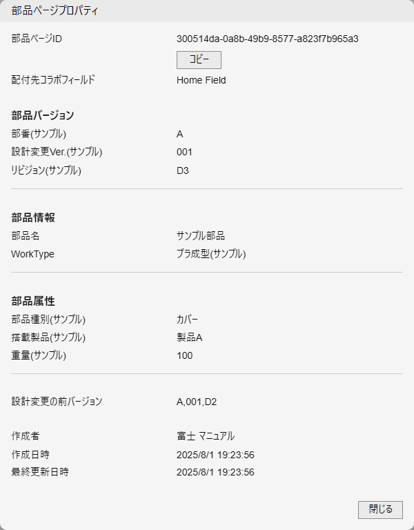 | 作成者 | 部品ページを生成したユーザー名が表示されます。 |