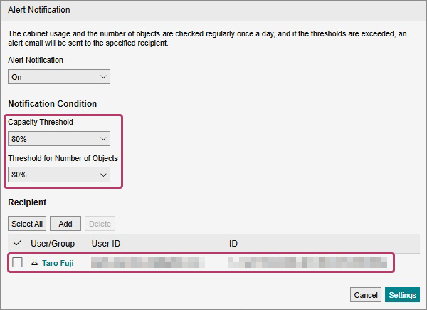 Up to three users can be notified. To add a user to notify, click [Add], then select the user from the address book.