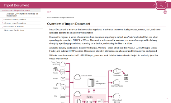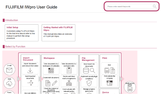 In [Select by Function] on the top page, you can click a function button (such as [Import Document] or [Workspace]) to display the manual for that function. You can then perform a search to search within the manual for that function. For example, if you click [Import Document] to display the manual for the Import Document function and perform a search, only the manual for the Import Document function will be searched. This search function works differently to the top page search function.