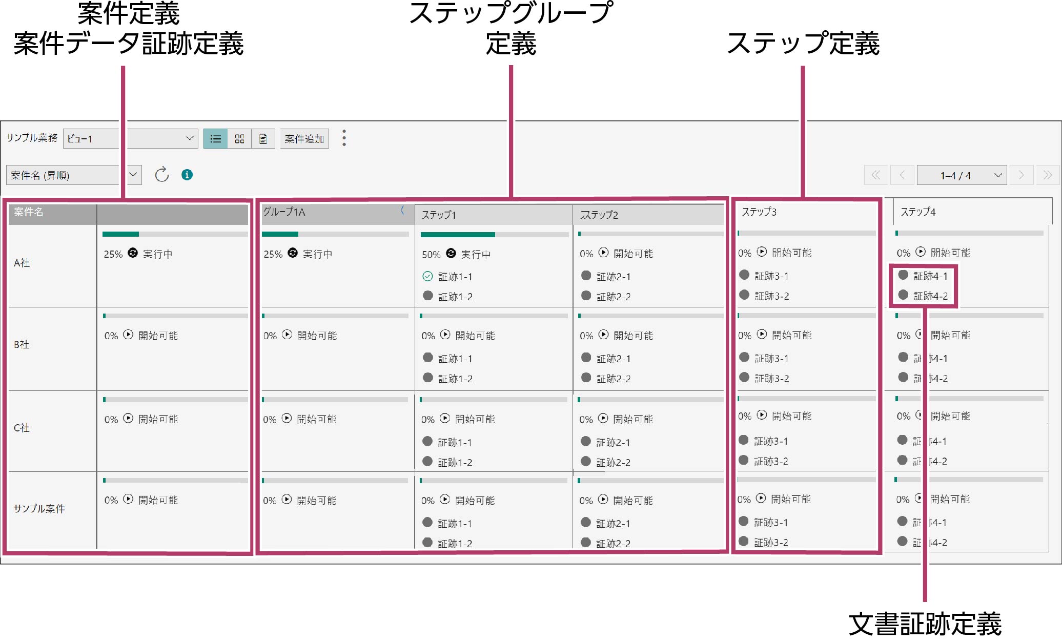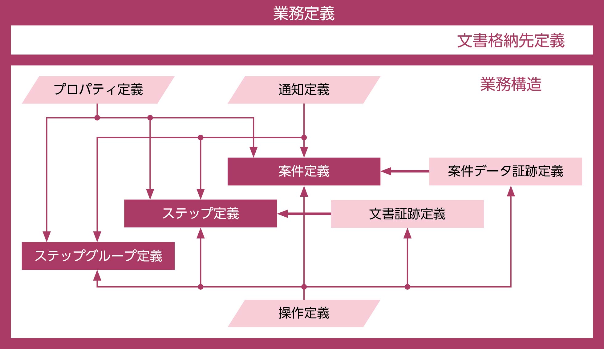 業務構造の定義は、業務プロセスの要素である案件、ステップ、ステップグループ、および証跡の定義と、進捗状況を表す指標であるプロパティの定義、業務情報に基づいて実行される通知や操作の定義などから構成されます。