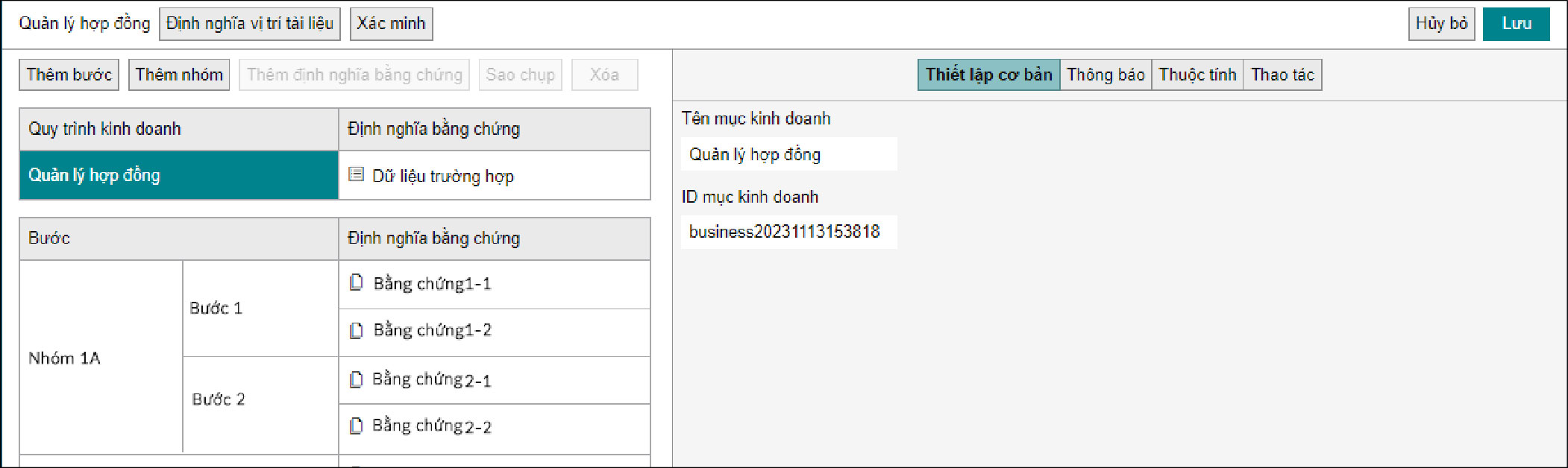 Thiết lập tên và ID, v.v... cho các cho phần tử của cấu trúc mục kinh doanh được chọn trên màn hình cấu trúc. Nếu bằng chứng được chọn, bạn có thể tạo mới, chỉnh sửa và xóa định nghĩa bằng chứng dữ liệu trường hợp hoặc định nghĩa bằng chứng tài liệu.
