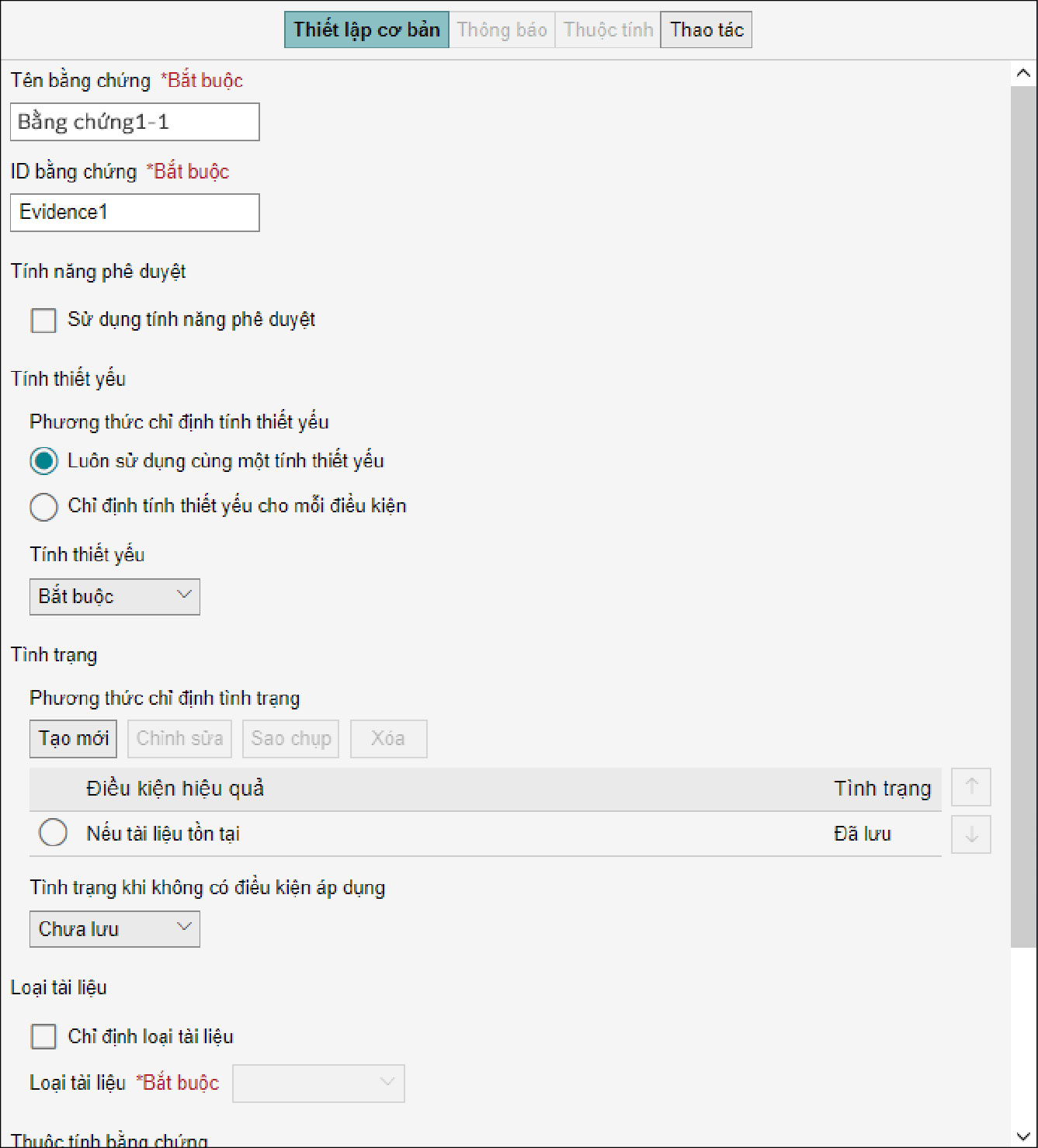 Các tình trạng của bằng chứng gồm có đã lưu, đang thực hiện và chưa lưu. Ngoài việc thiết lập điều kiện cố định, bạn cũng có thể thay đổi điều kiện theo tình trạng của bằng chứng.