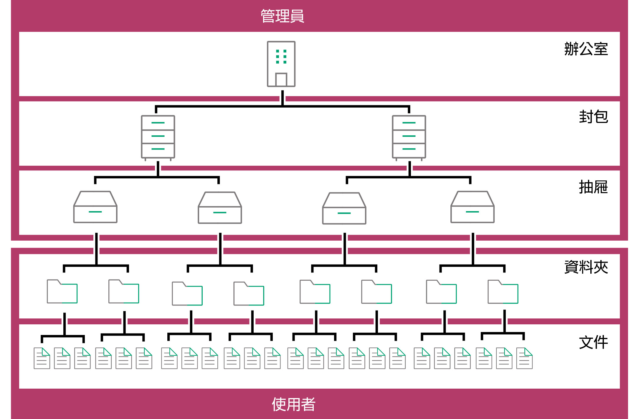 辦公室內建立多個封包,封包內建立多個抽屜。可以在建立的封包和抽屜中建立資料夾、登記文件。