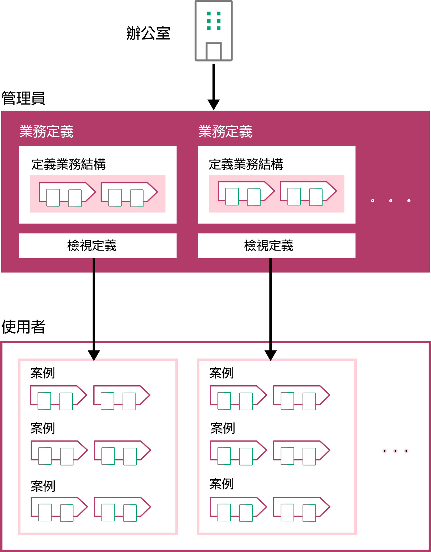 管理員對各業務建立業務定義。業務定義中,定義作業流程的可視化業務結構和判斷業務進度狀況的規則等。此外,定義檢視定義,為各使用者顯示[案例總覽]畫面的內容。檢視定義中,定義顯示資訊的範圍、可以執行的操作的種類、使用檢視的權限等。可以對各業務設定多個檢視定義。