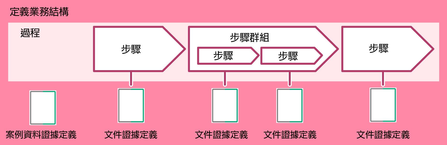 業務結構定義由步驟定義和步驟群組定義組成。步驟定義表示作業的各流程。步驟群組定義是多個步驟的組合。步驟定義或步驟群組定義中定義文件證據定義,用以登記證據。