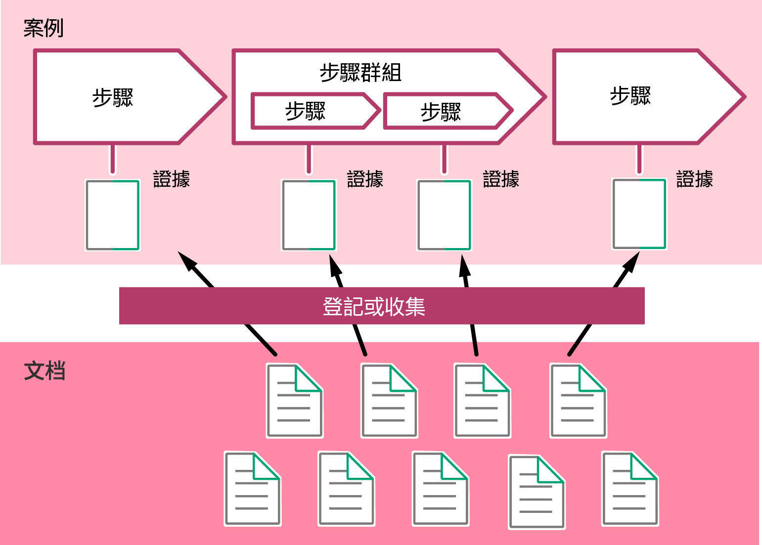 管理員設定業務定義後,使用者建立案例,根據各案例的證據登記狀況管理實際的作業進度。