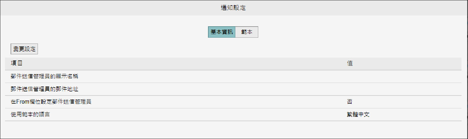 在[郵件送信管理員的顯示名稱]、[郵件送信管理員的郵件地址]、[在From欄位設定郵件送信管理員]和[使用範本的語言]中,設定要變更的項目,點選[變更]。