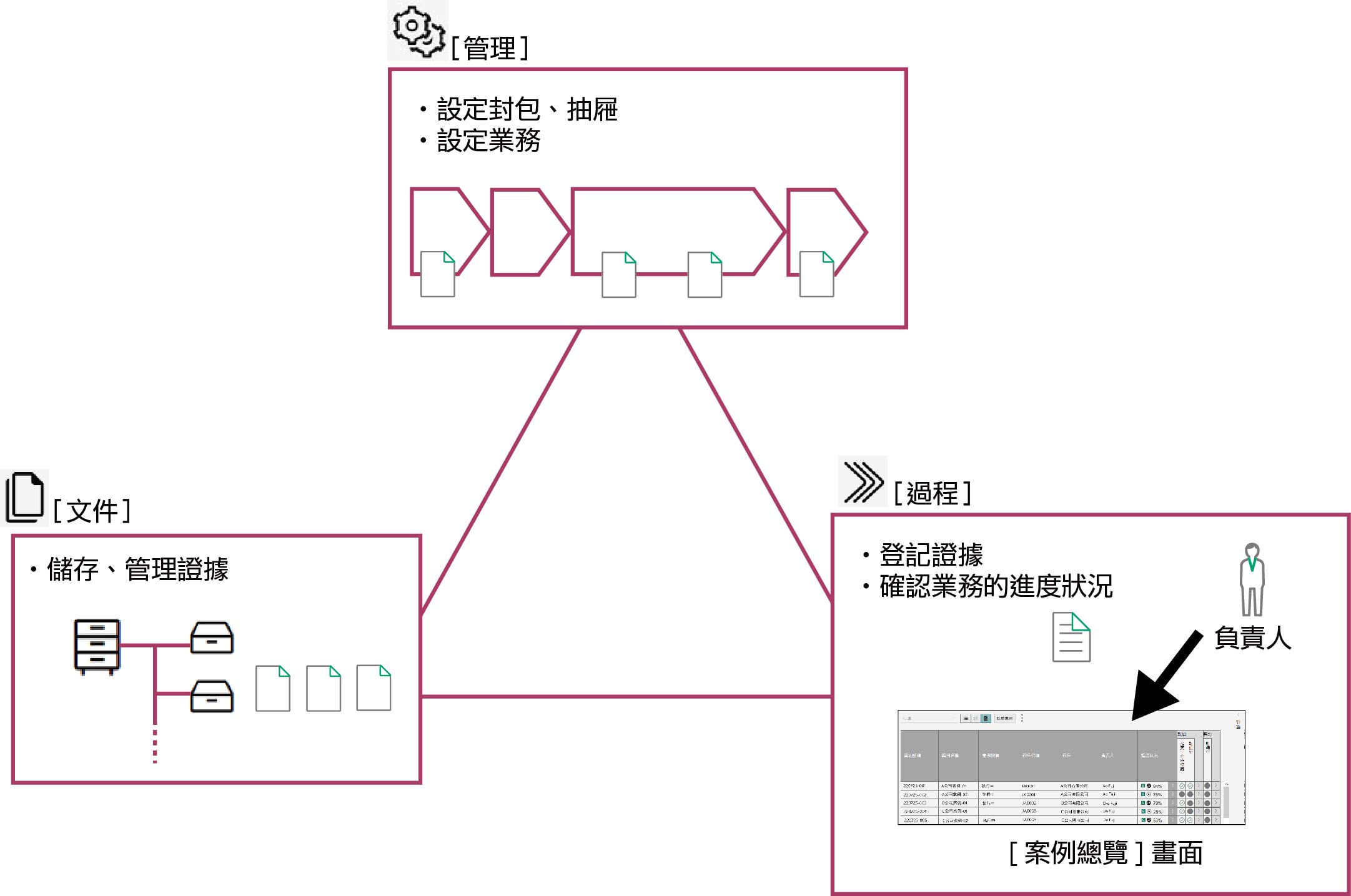 各作業的負責人在FUJIFILM IWpro文件管理的[過程]的[案例總覽]畫面上登記證據,作為作業的結果。負責人登記的證據儲存在FUJIFILM IWpro文件管理的[文件]中,依證據儲存狀況,自動更新業務進度狀況。