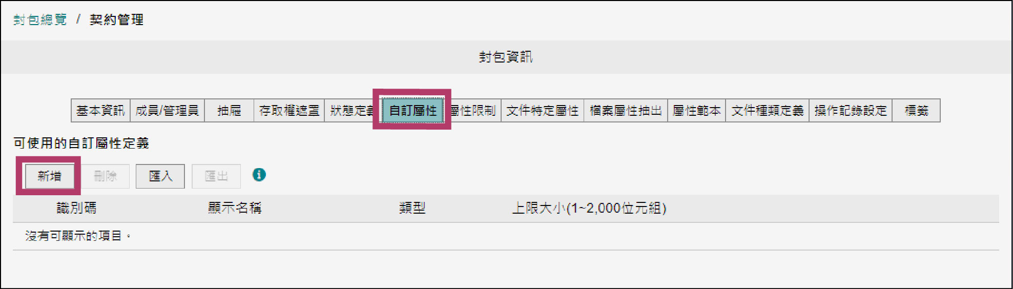 在「契約管理」封包的[封包資訊]畫面上點選[自訂屬性]標籤,點選[新增]。