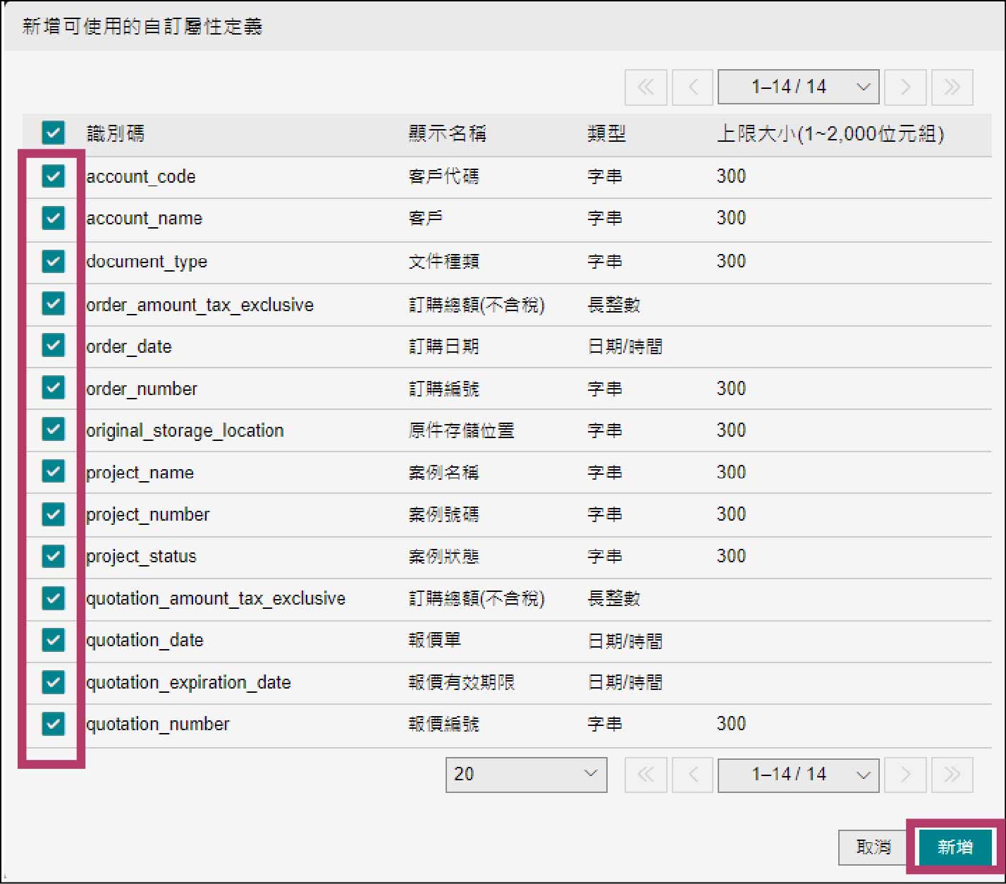 選中以下自訂屬性定義,點選[新增]。