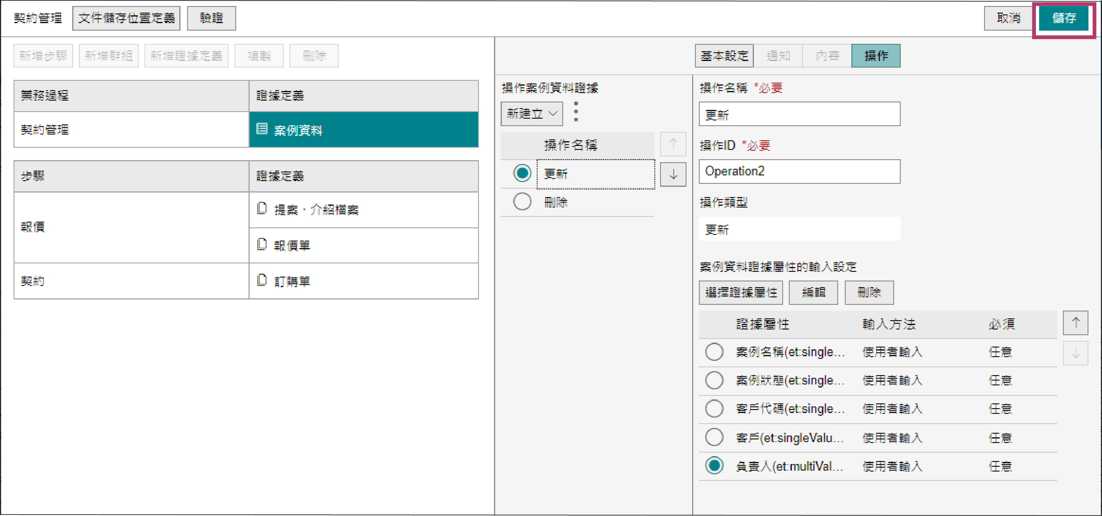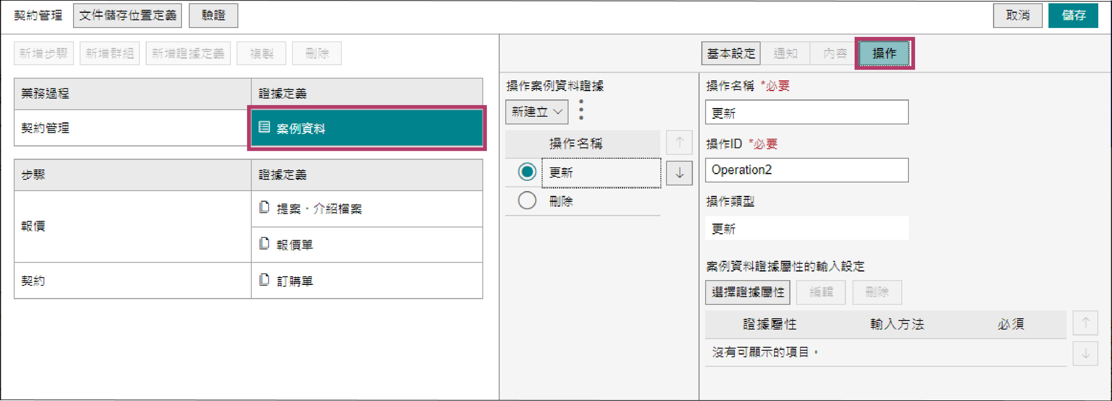 在「契約管理」業務定義的結構編輯器畫面上選擇[案例資料],點選[操作]標籤。