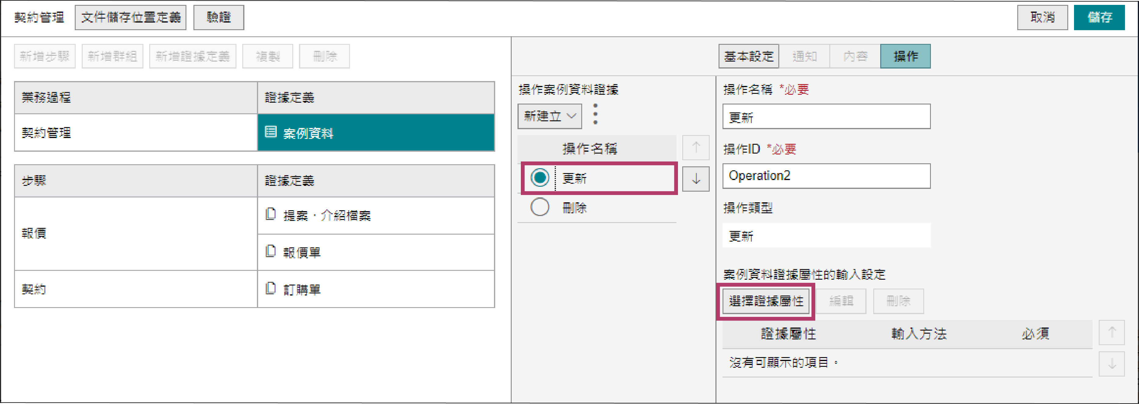 在[操作案例資料證據]上選擇[更新],點選[案例資料證據屬性的輸入設定]的[選擇證據屬性]。