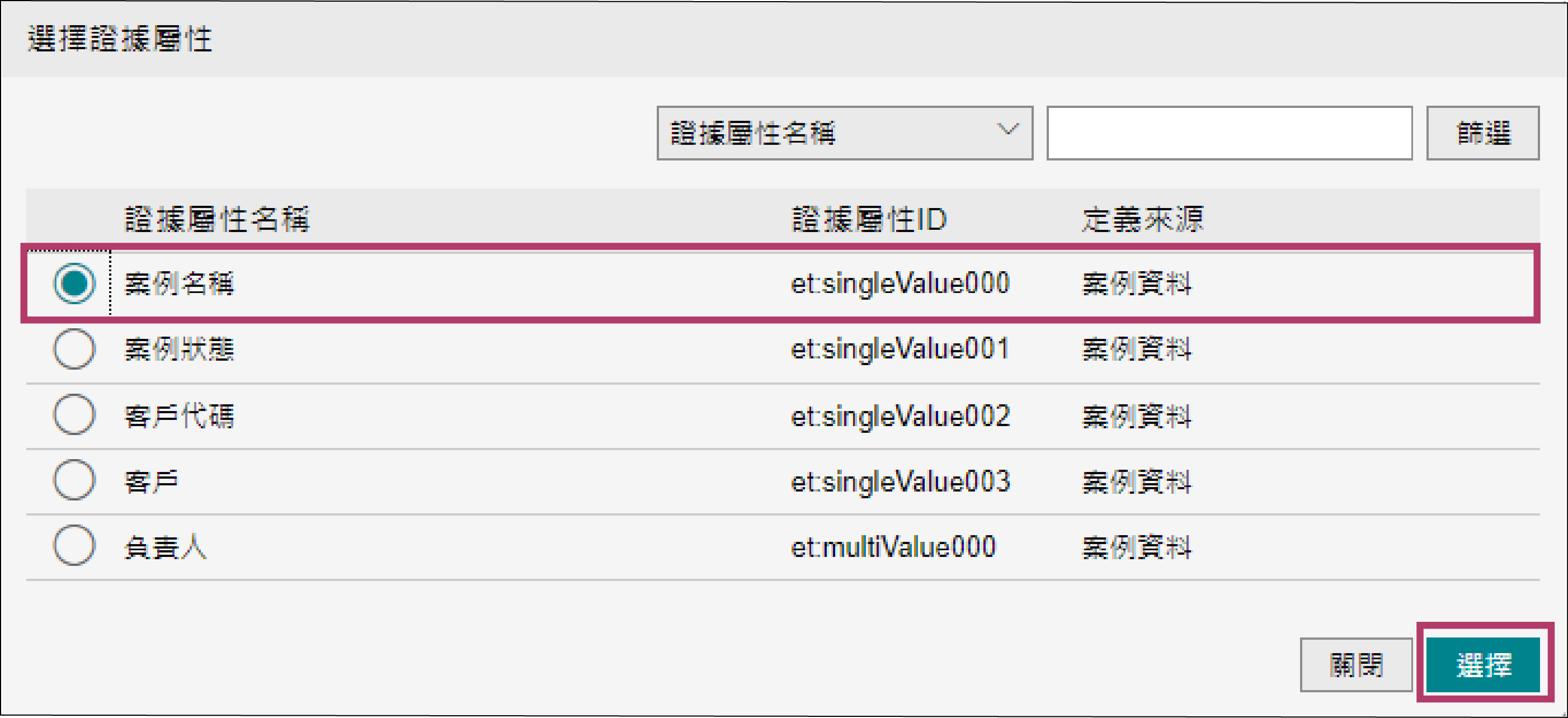 | 案例狀態 | 案例狀態 | 使用者輸入、自由輸入 ·初值 參照證據屬性值、案例資料:案例狀態 |