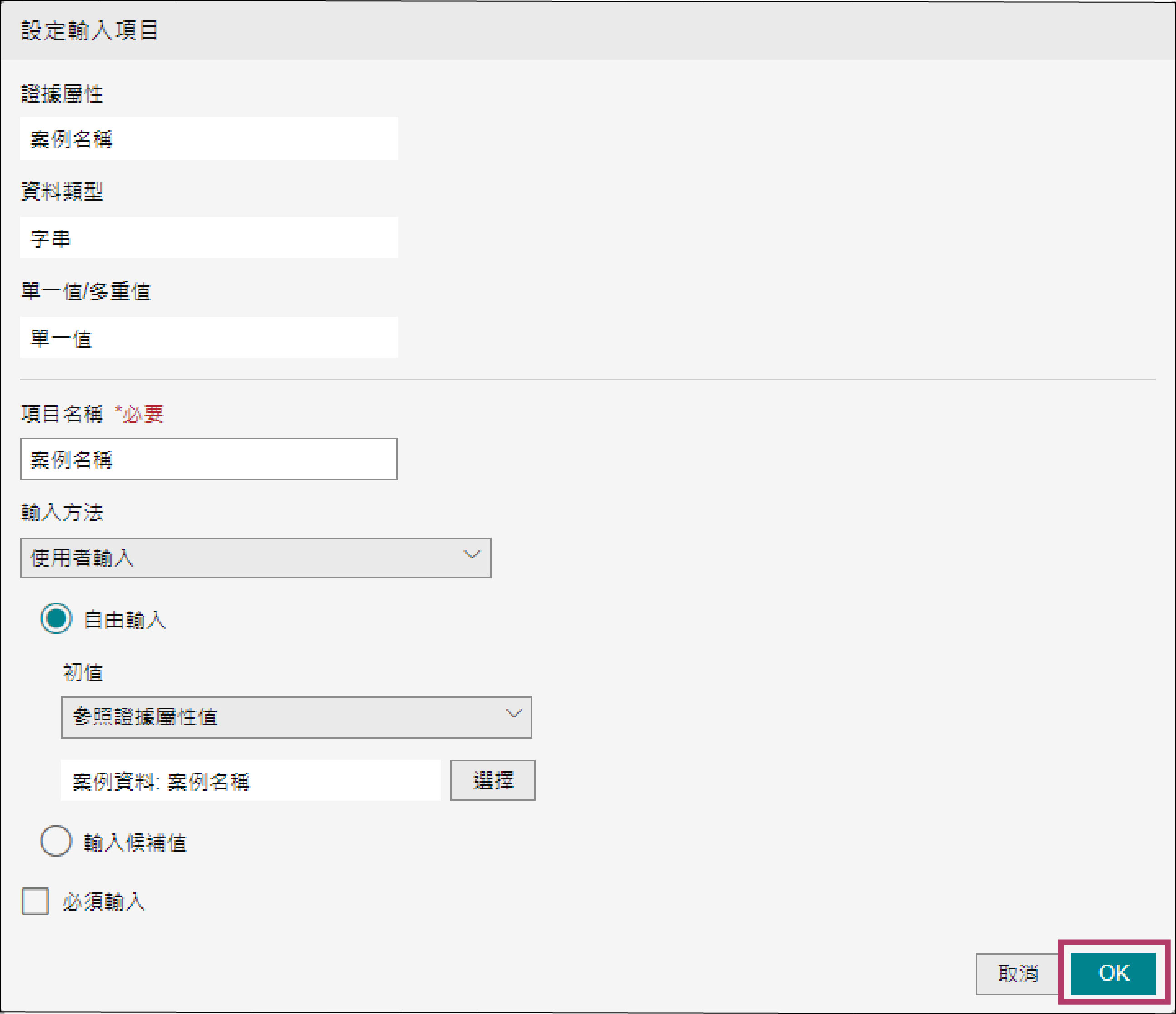 「案例名稱」被新增至[案例資料證據屬性的輸入設定]總覽中。