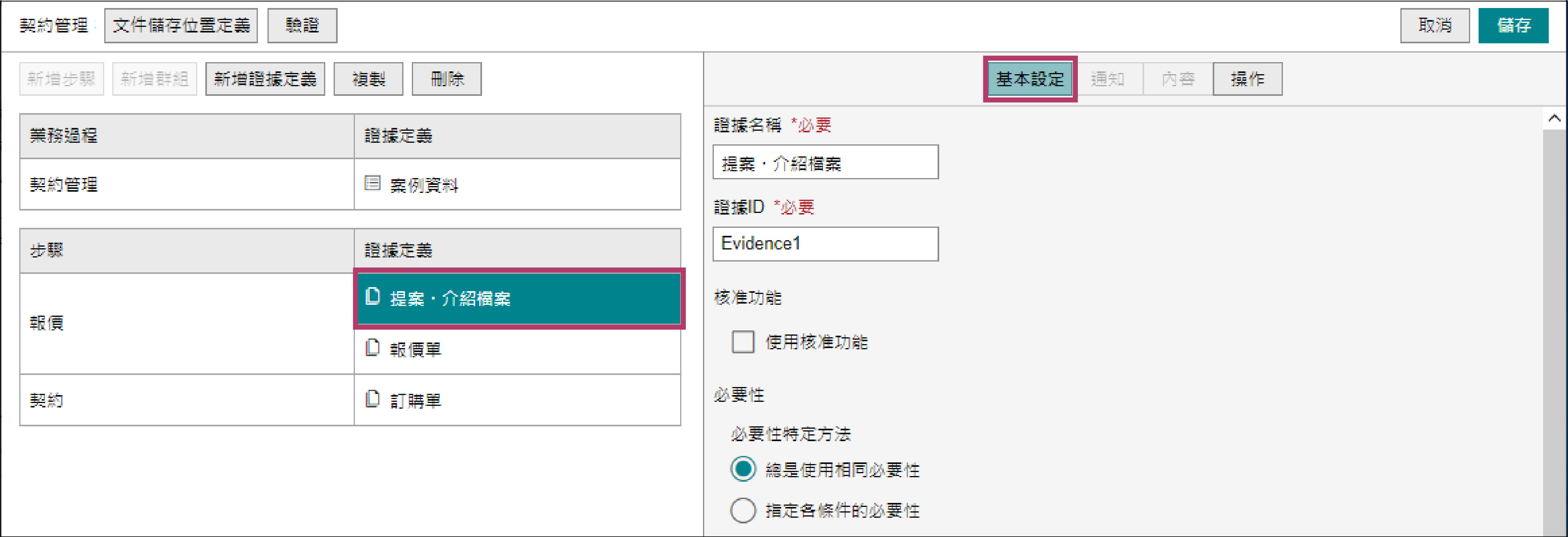 在「契約管理」業務定義的結構編輯器畫面上選擇[提案·介紹檔案],點選[基本設定]標籤。