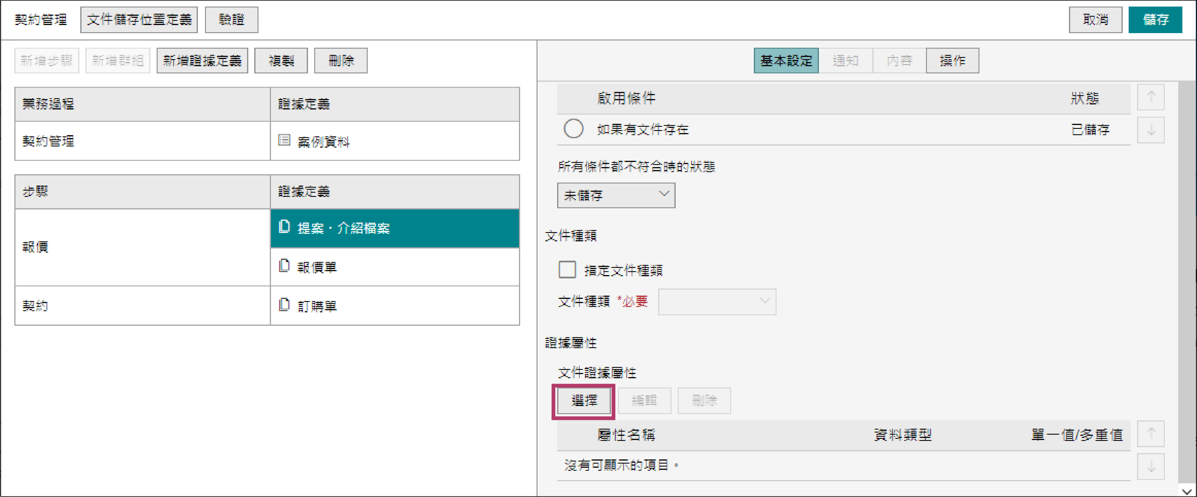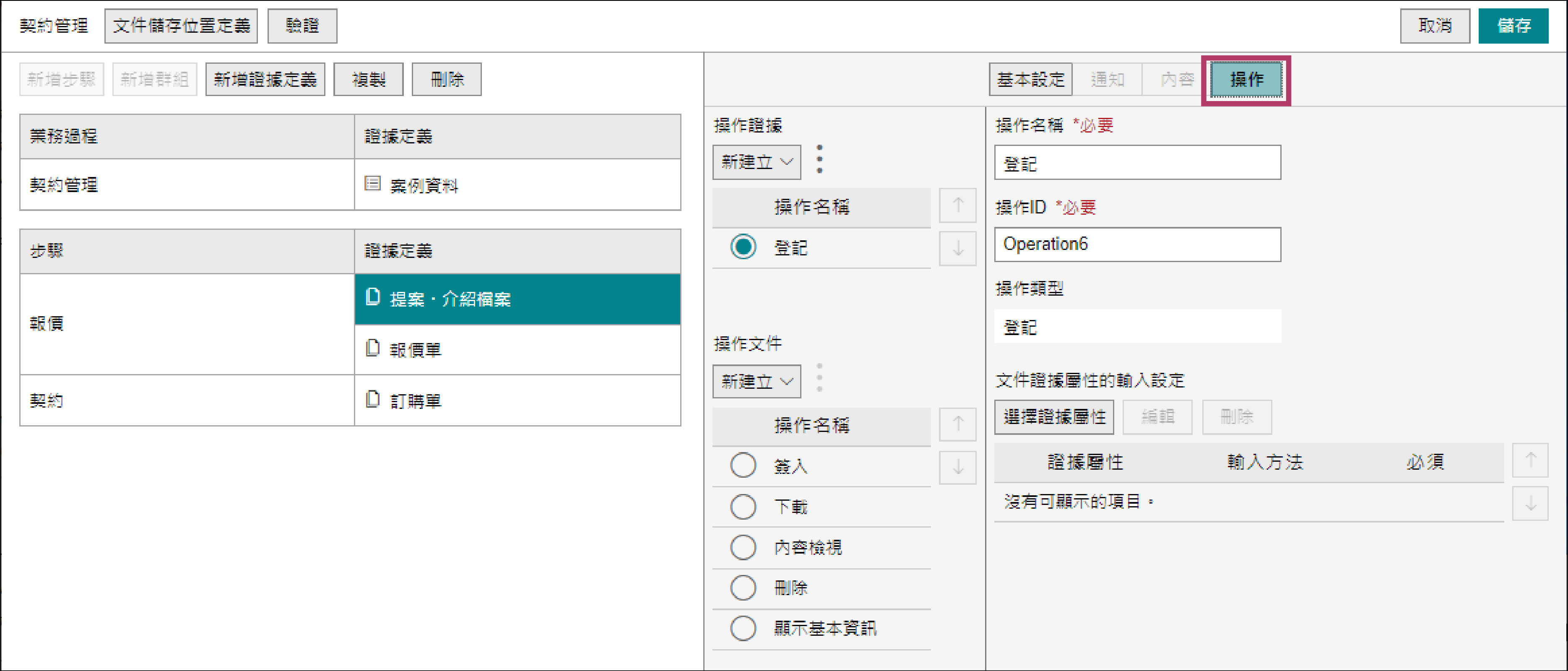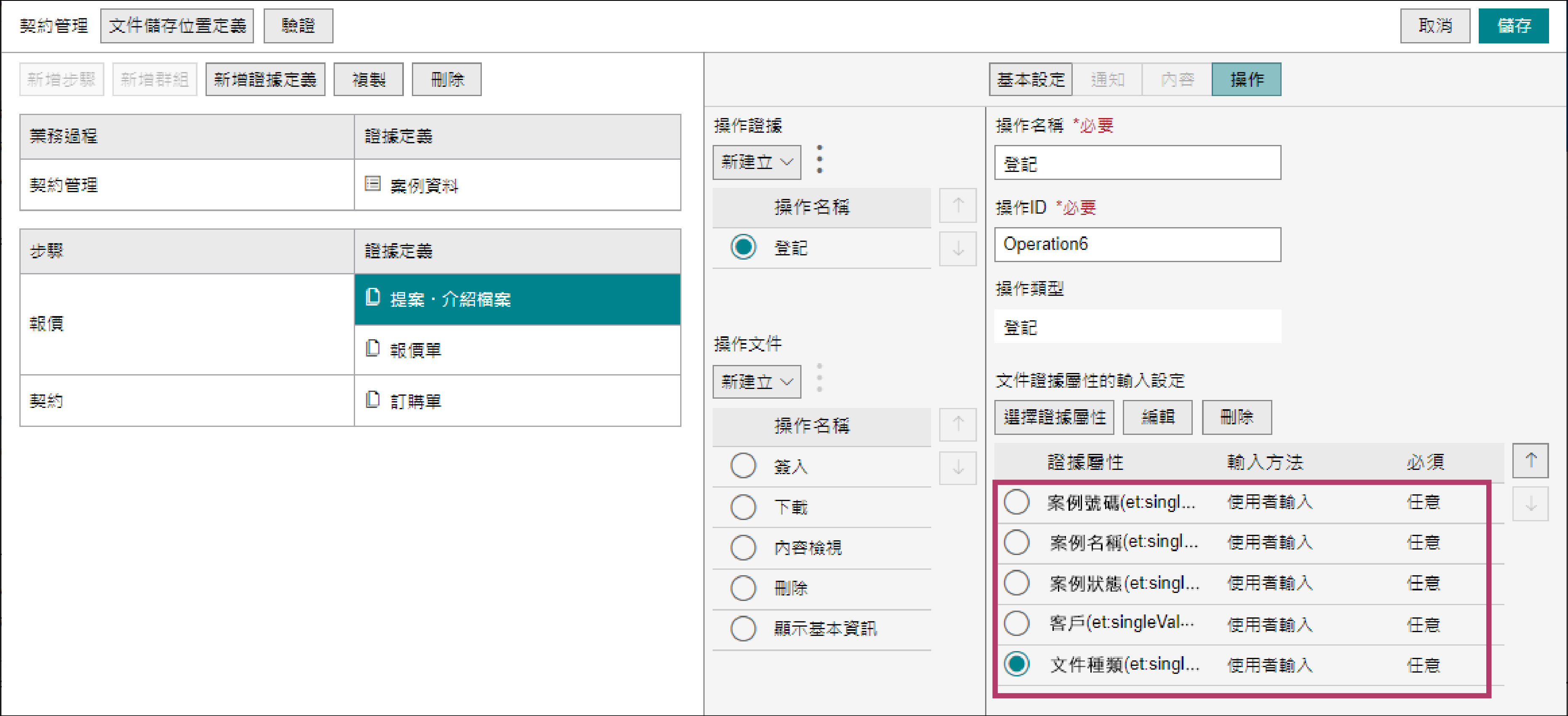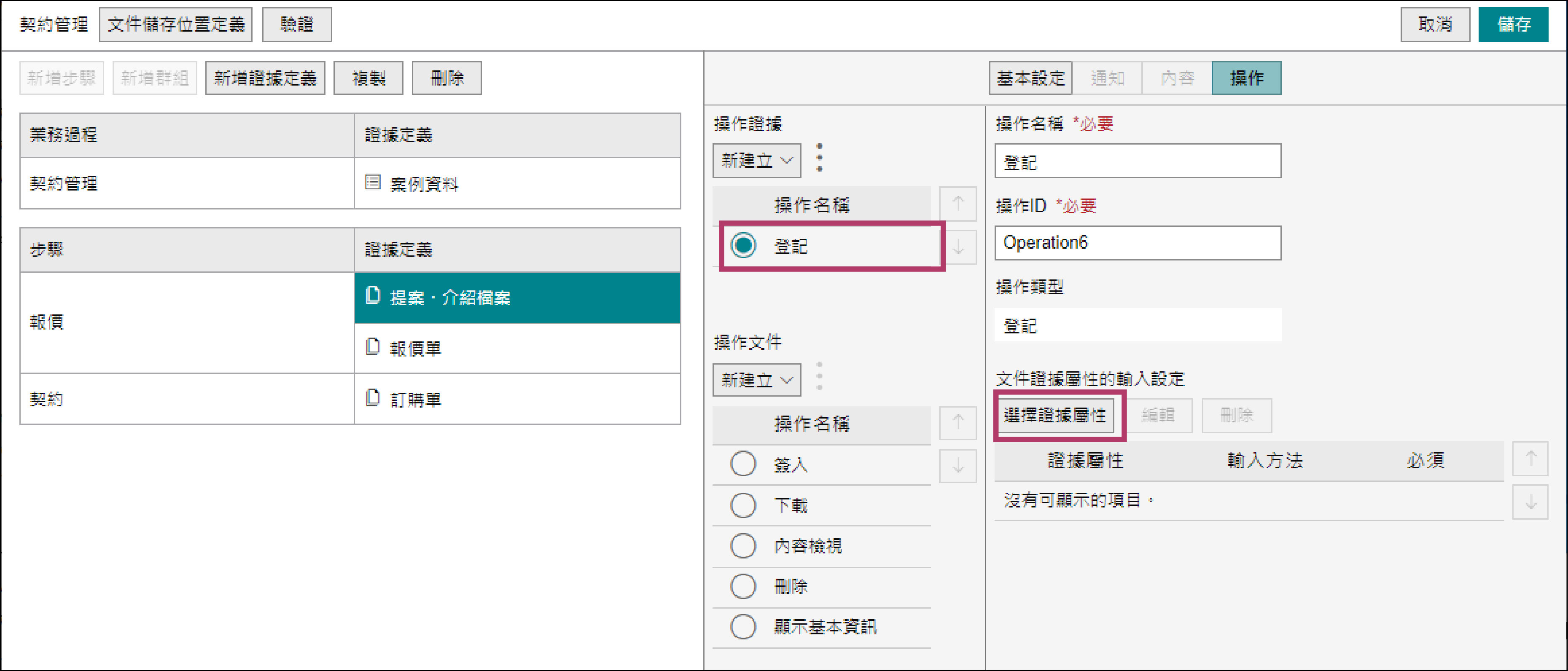 選擇[操作證據]的[登記],點選[文件證據屬性的輸入設定]的[選擇證據屬性]。