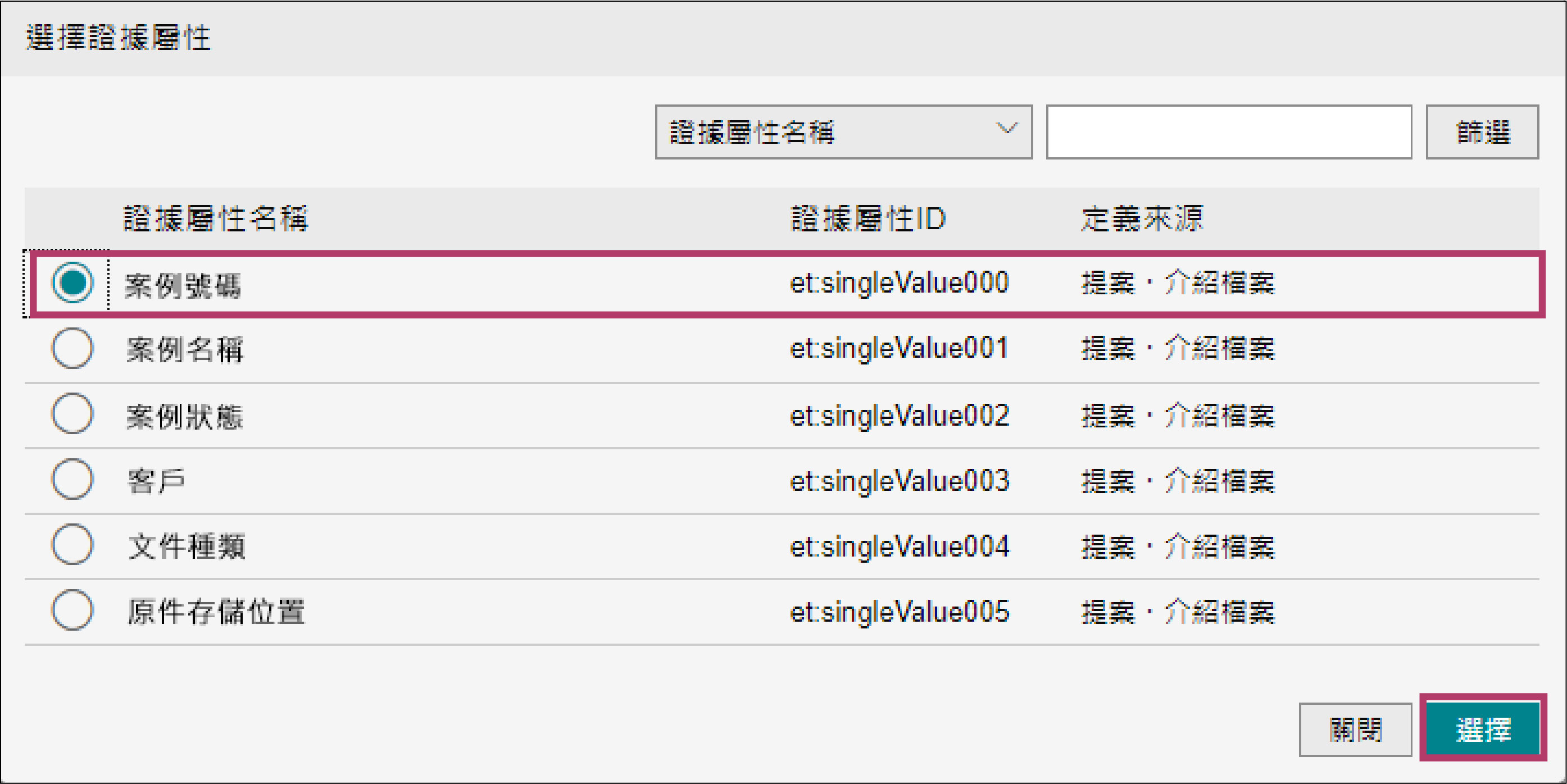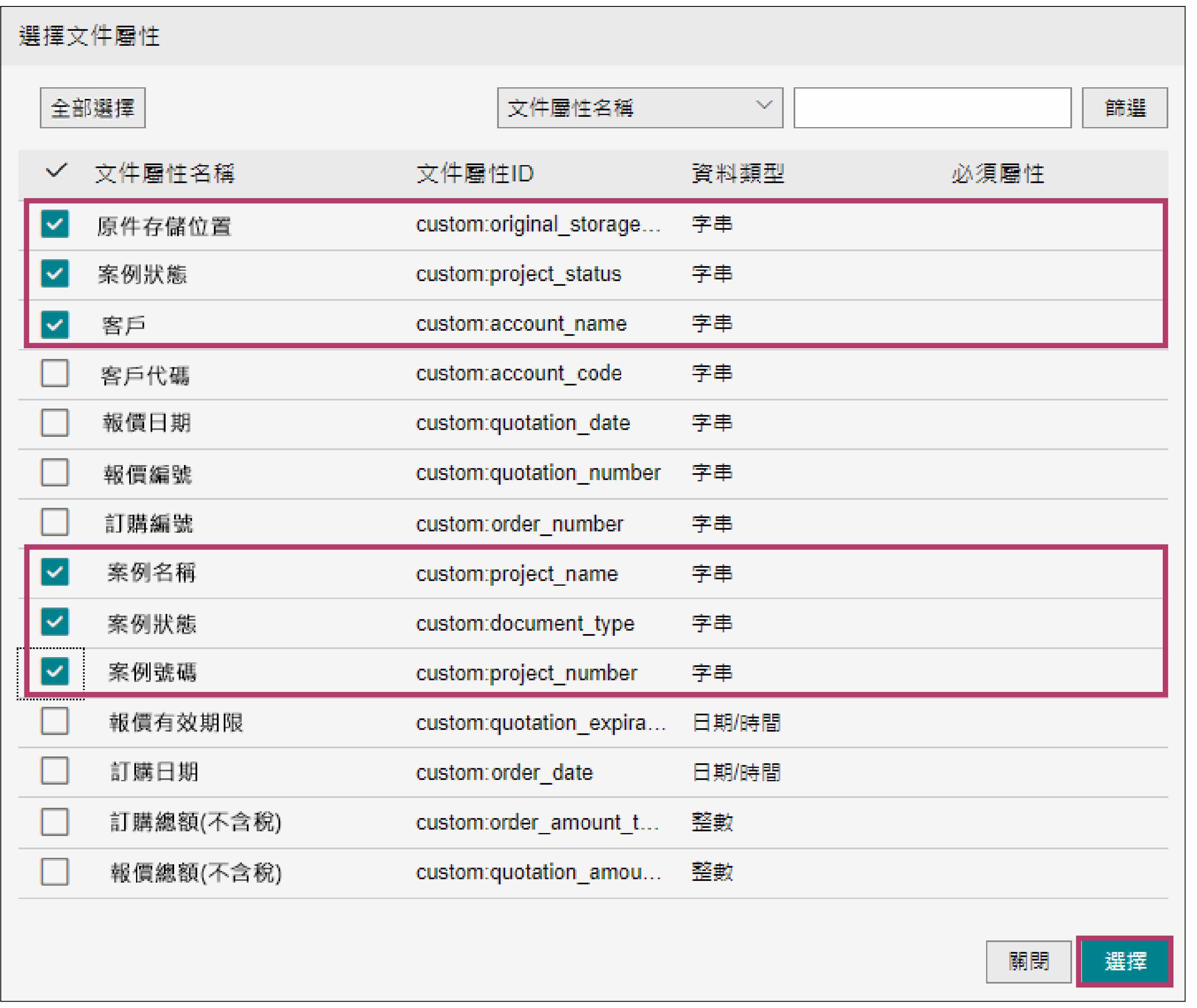 所選擇的屬性被新增至[文件證據屬性]總覽。